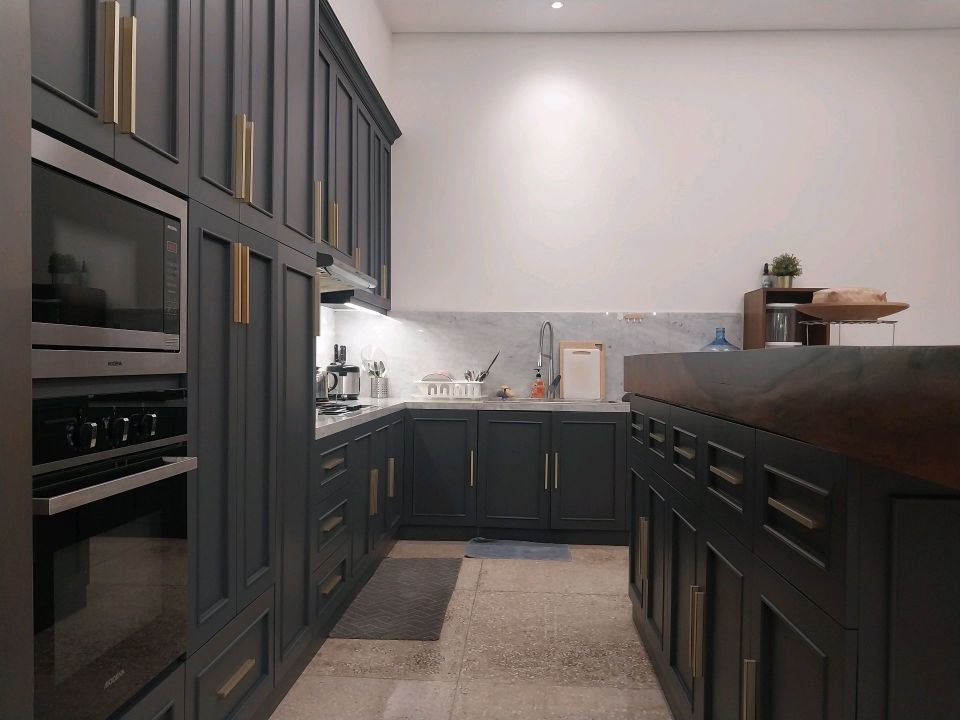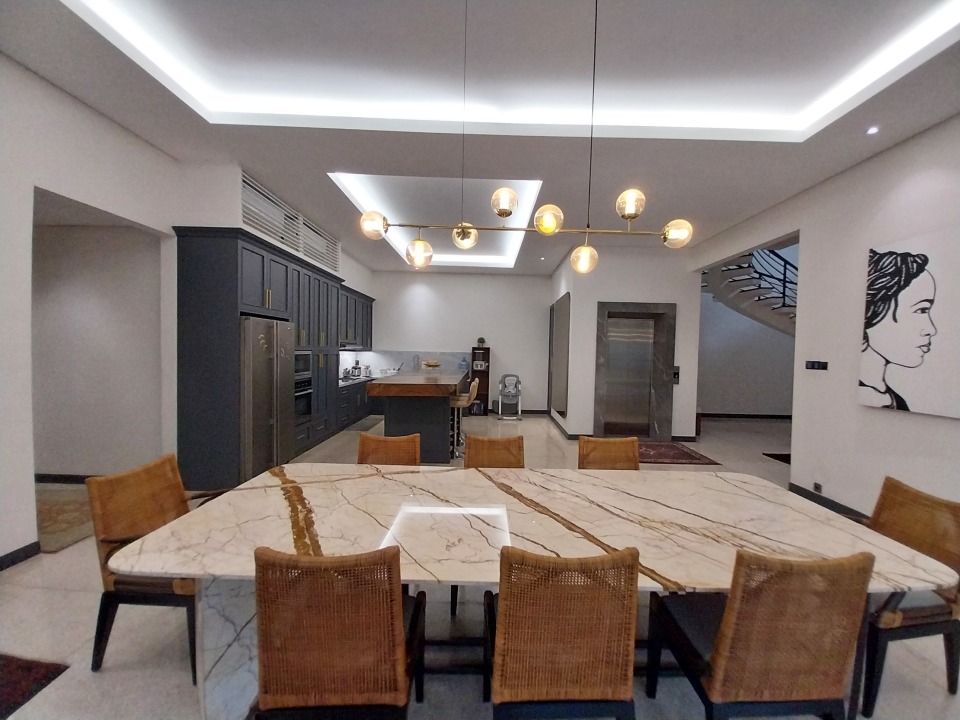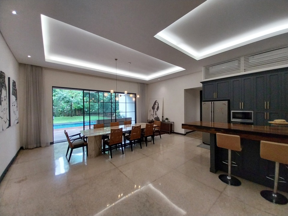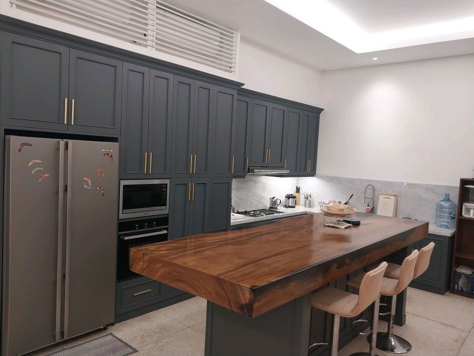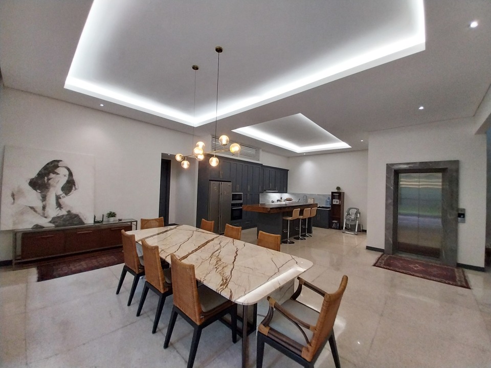 - Konsep dapur modern terbuka yang menyatu dengan ruang makan.