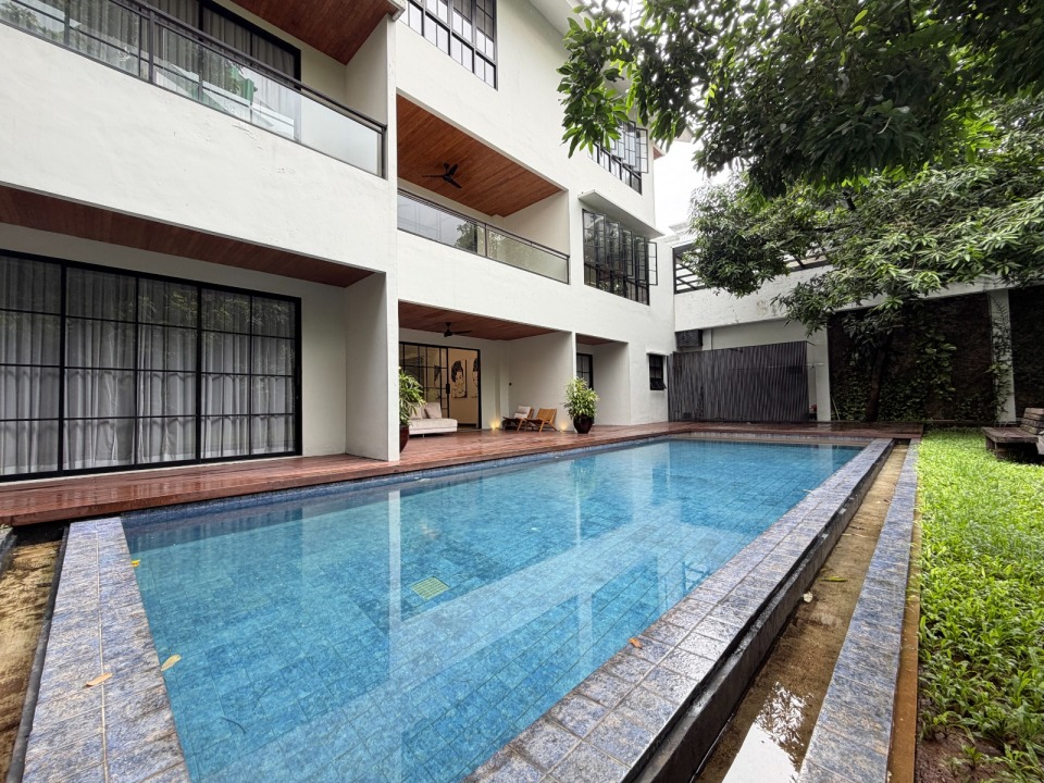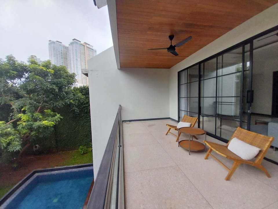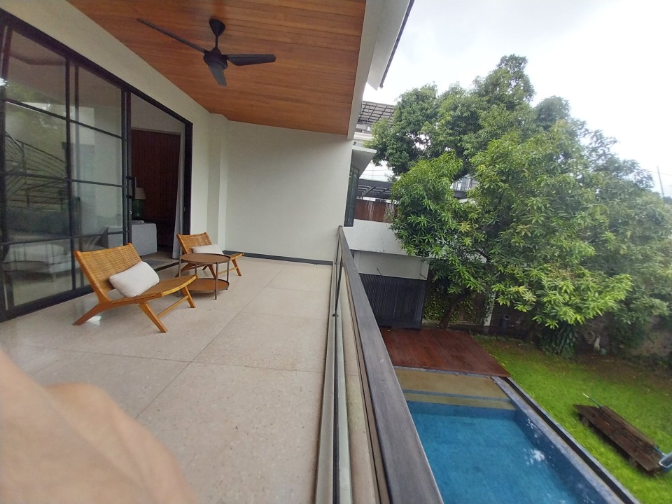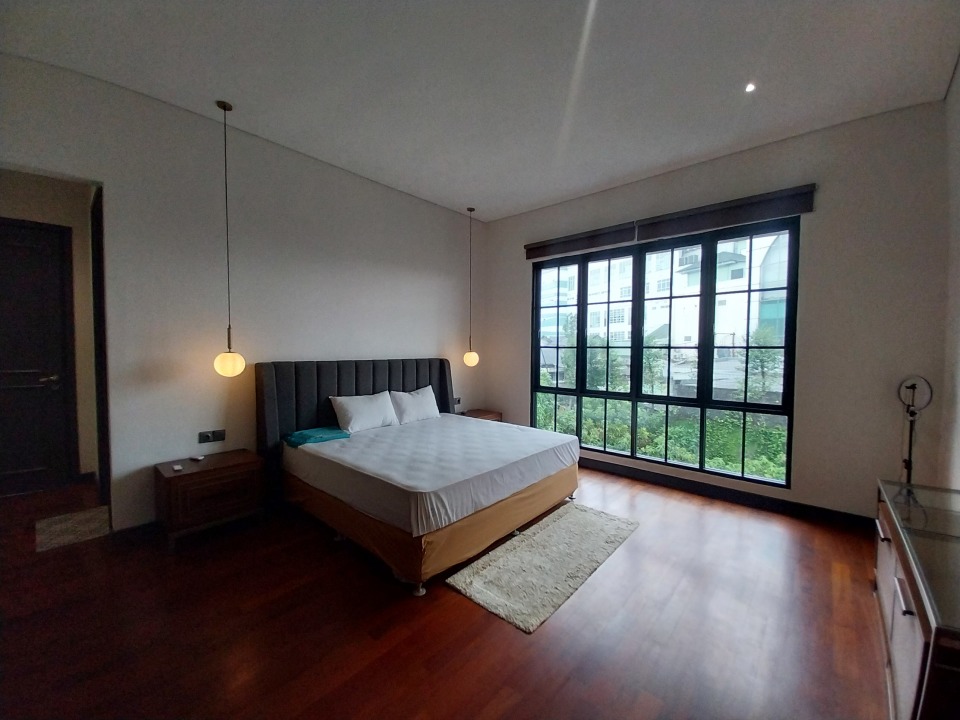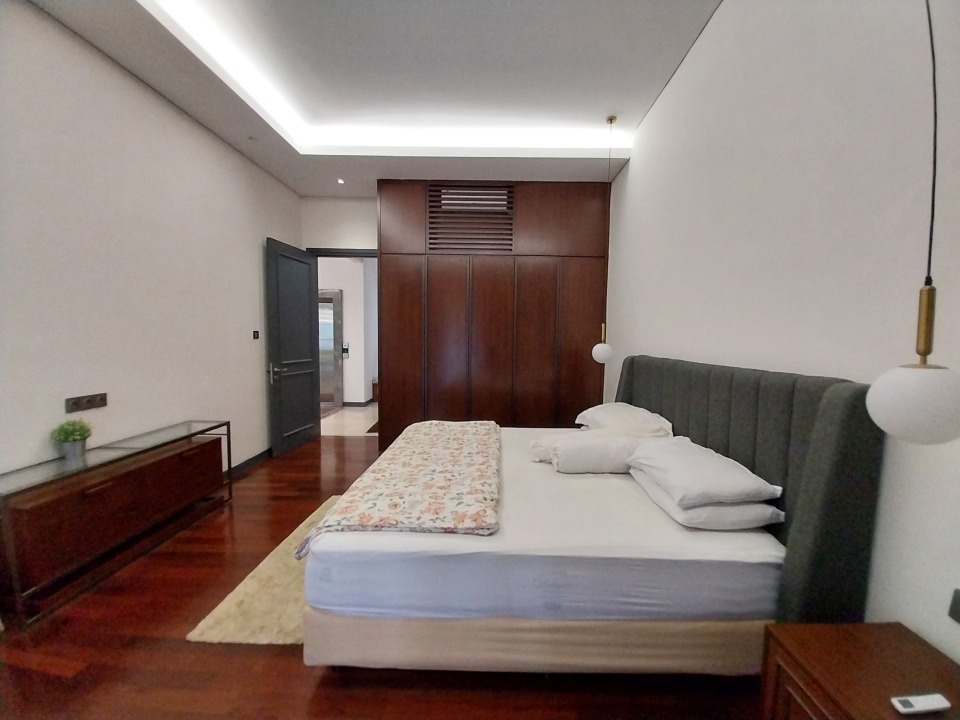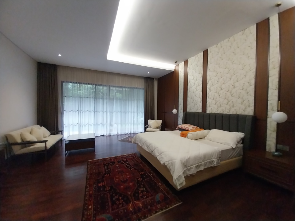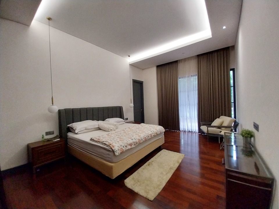 - Kamar tidur utama luas dengan pemandangan kolam renang dan teras luas.